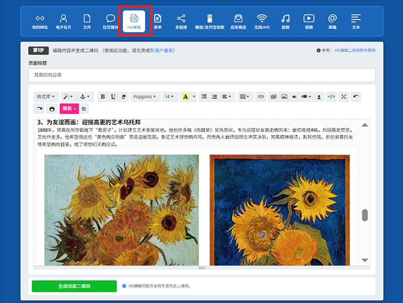 二维彩虹的【H5编辑】功能,相当于为你提供了一个网页页面,你可以像编辑Word文档一样,在一个页面里自由排版,最终生成一个精美的H5展示页,并将这个页面与二维码绑定。