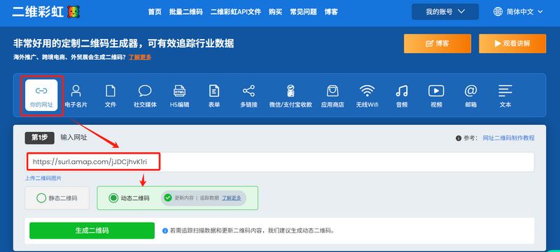 在首页的功能列表中,找到并选择 “你的网址” 这个选项,因为导航链接本质上就是一个网址URL,将刚才复制的导航链接粘贴到输入框中。此时,你需要选择生成“动态二维码”还是“静态二维码”: