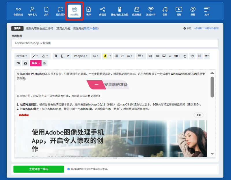 在二维彩虹官网首页,选择“H5编辑”选项。在编辑界面,你可以像写文档一样,插入图片、添加文字说明、调整排版,把这个软件安装的每一步都清晰地呈现出来。填写完毕后,点击生成二维码。