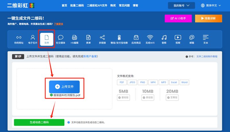3. 制作文件二维码:在首页功能栏找到“文件”选项,这是专门用于上传文档、图片生成二维码的功能,精准适配检测报告文件生成需求。点击上传按钮,选择提前准备好的面料检测报告PDF或图片,并点击生成二维码。