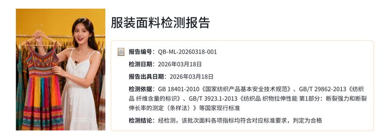 当下消费者越来越注重服装安全与品质,尤其是母婴服饰、高端面料服装,主动展示检测报告,能直观证明面料无甲醛、成分真实、色牢度达标,打消消费者顾虑,减少“是不是纯棉”“有没有有害物质”这类咨询,有效提升下单转化率,打造店铺品质口碑。