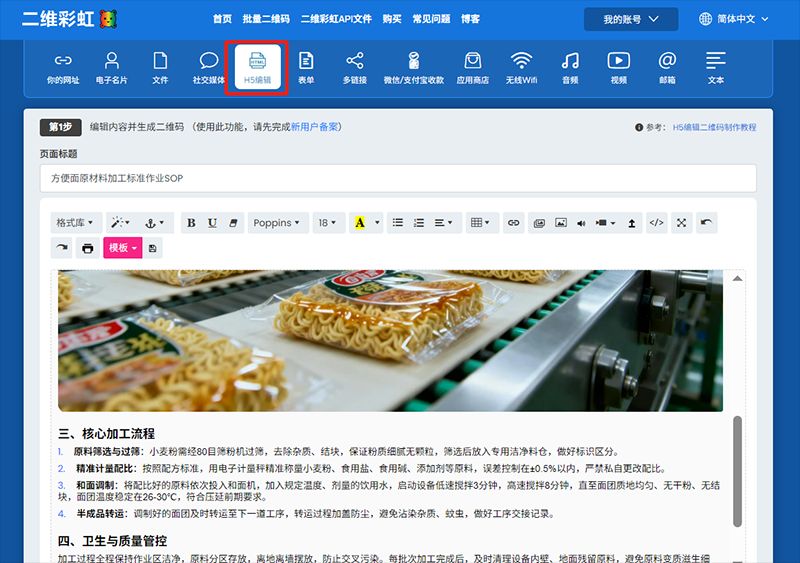 在官网首页的功能选项中,找到并点击“H5编辑”选项,在这个页面编辑SOP的文字、图片,还可以插入视频链接展示视频等,编辑完成后点击生成动态二维码