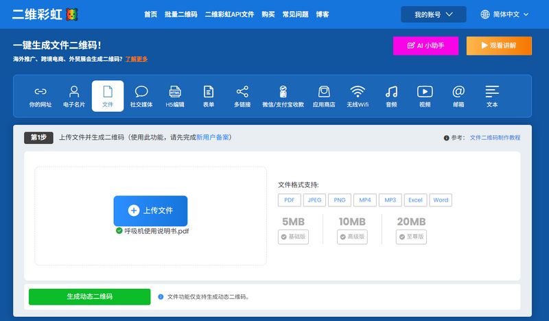2. 选择【文件】功能,在这里上传准备好的文件,然后点击生成二维码。