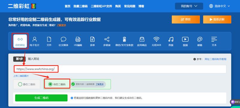选择【你的网址】功能,在下面的网址框中粘贴公司招聘网页的网址链接,点击“生成二维码”按钮。一般我们建议您生成“动态二维码”,因为动态二维码具有追踪扫描数据的功能,方便后续追踪了解招聘活动的推进情况。下图中仅作为示例: