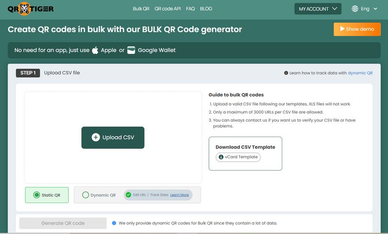 官网首页选择【Bulk QR】,进入这个页面下载模板,填写模板,上传模板,就可以快速生成多个电子名片二维码。
