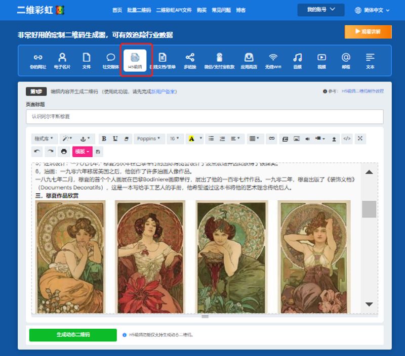 登录二维彩虹官网,选择“H5编辑”选项,在此界面,可以插入文字描述、图片展示,以及语音音频,还能插入音频链接。所以,通过H5编辑功能,我们可以将整个展览中所有的作品讲解汇集在一个二维码中。