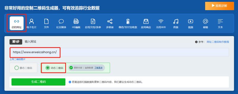 在输入框中粘贴您的企业官网网址。点击“生成动态二维码”。请注意,只有动态二维码才具备追踪扫描数据的功能。如果您在这里选择了“静态二维码”,那么是在使用的时候是无法追踪任何扫描数据的。如果是商业场景应用,更适合动态二维码。