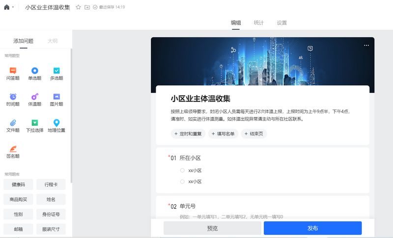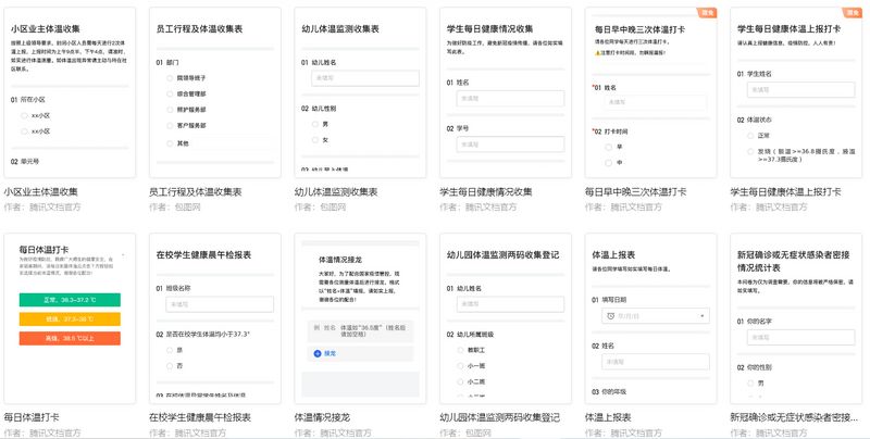 然后会在这个界面看到非常多的模板。比如:小区业主体温收集表、学生每日健康体温上报打卡、员工疫情期间每日填报、发热患者及密切接触者管控登记表、新冠确认或无症状感染者密接情况统计表......